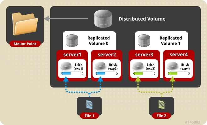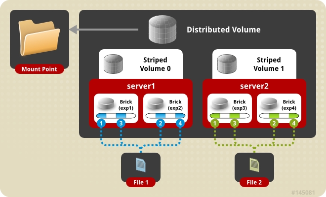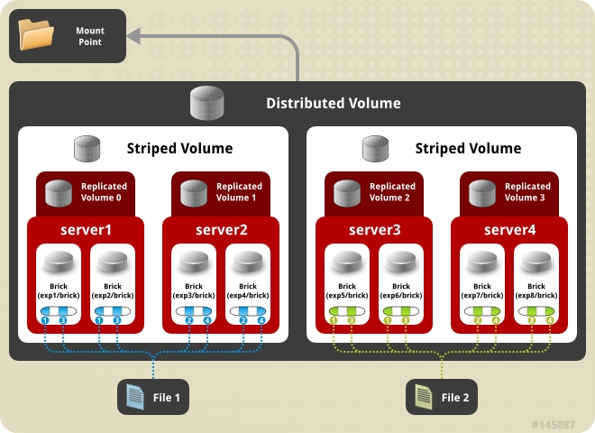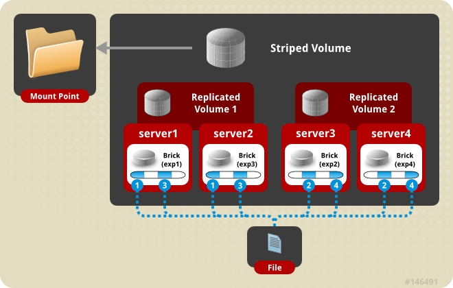 stripe 2 replica 2 transport tcp server1:/exp1 ... server4:/exp4 # R->S (*)